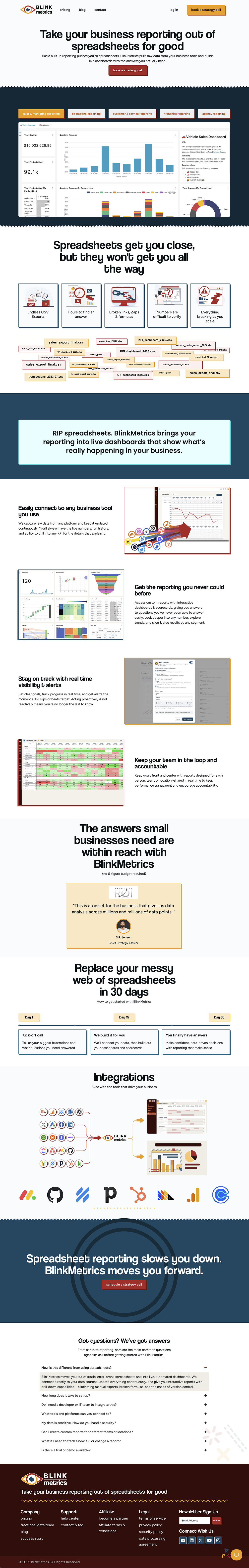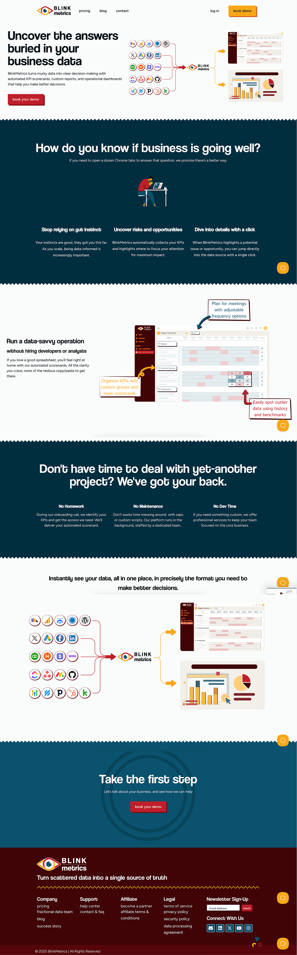 Blinkmetrics came to Fletch during a phase of experimentation and trying to find product-market-fit. They were exploring how to help SMBs make sense of their business performance, but the messaging wasn’t landing. It leaned too heavily on BI and data terminology — words like “business reporting” and “data-driven decision-making” — which didn’t reflect how their target audience actually talked about their work. People visited the site but left unsure of what the product did, who it was for, or why it mattered.