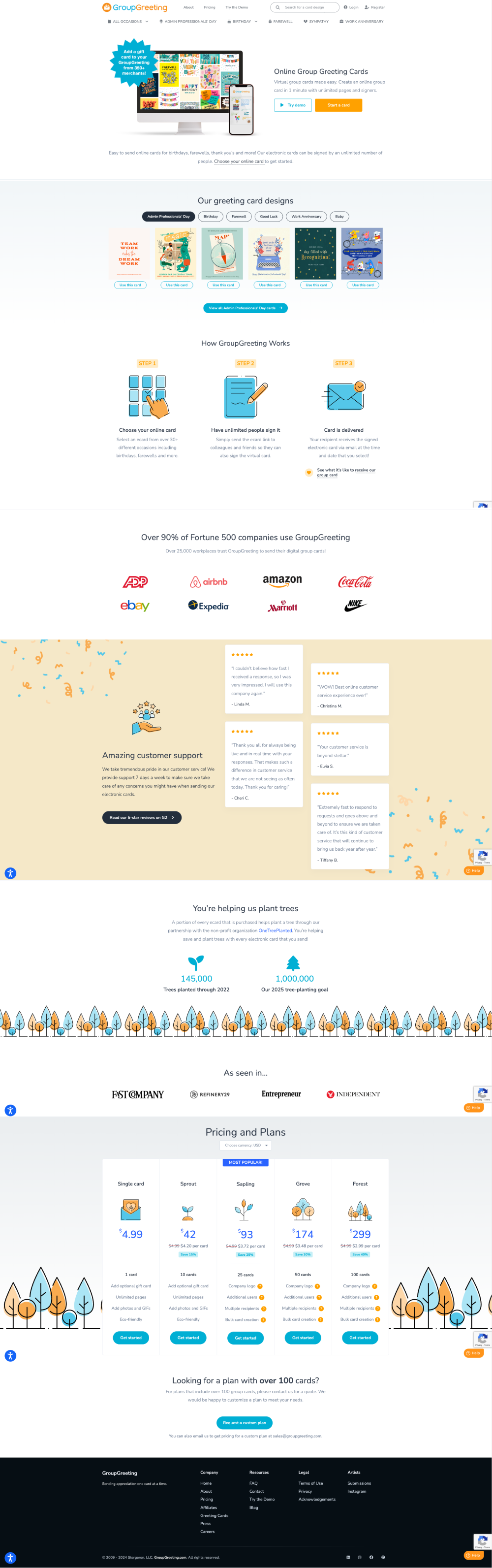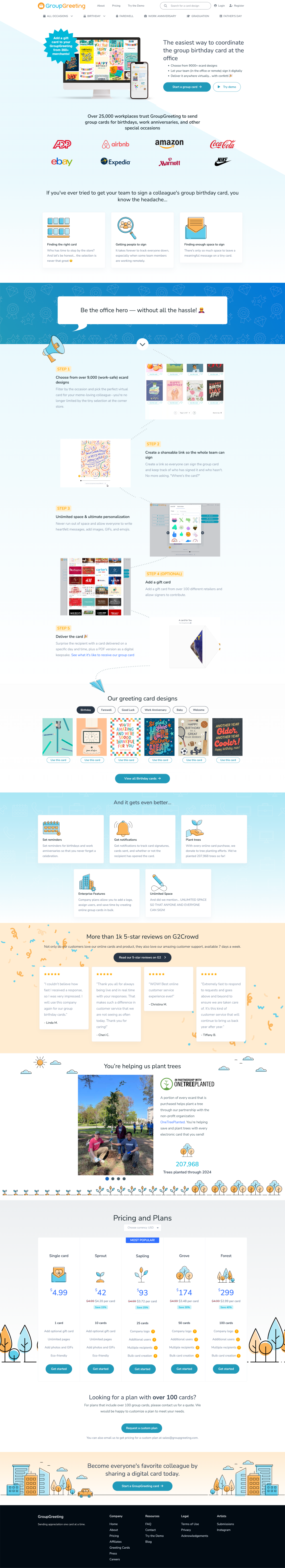 GroupGreeting offers a platform for sending customizable group ecards for various occasions, with features including unlimited signers, photos, GIFs, and gift cards, supported by customer service available seven days a week. They came to Fletch to establish foundational positioning and messaging they could rally their GTM efforts around, specifically starting with a new homepage design and copy. We helped them narrow down to their best use case: coordinating the group birthday card in an office.