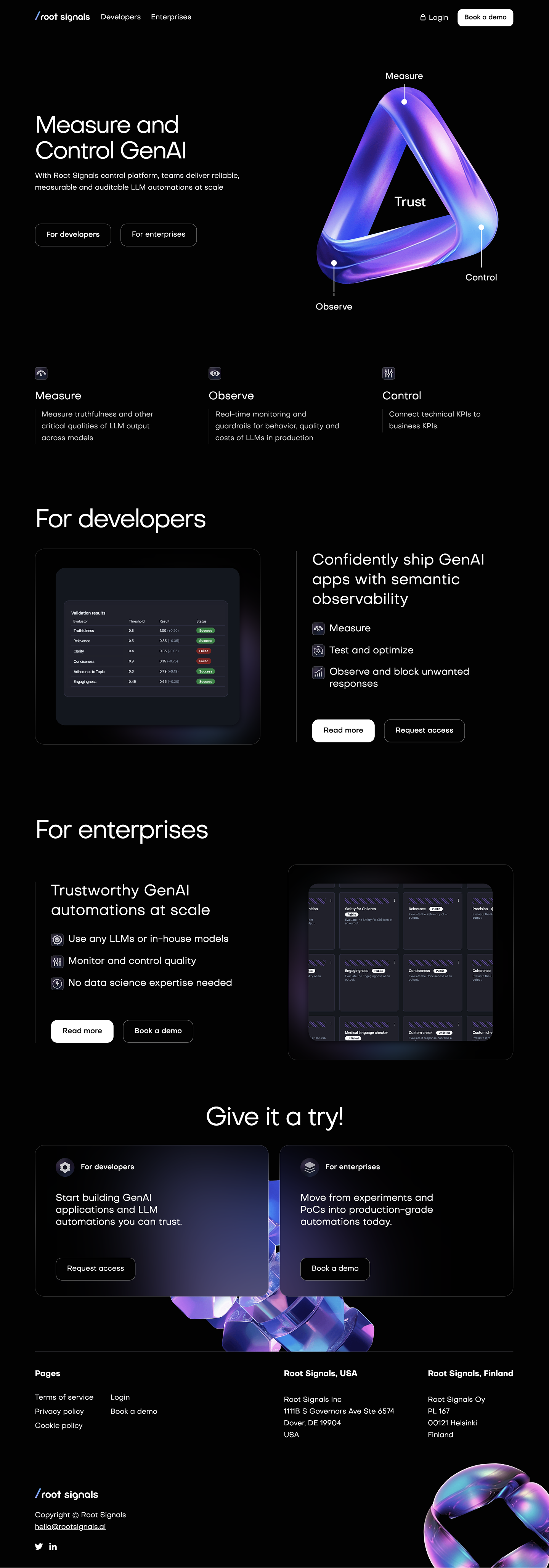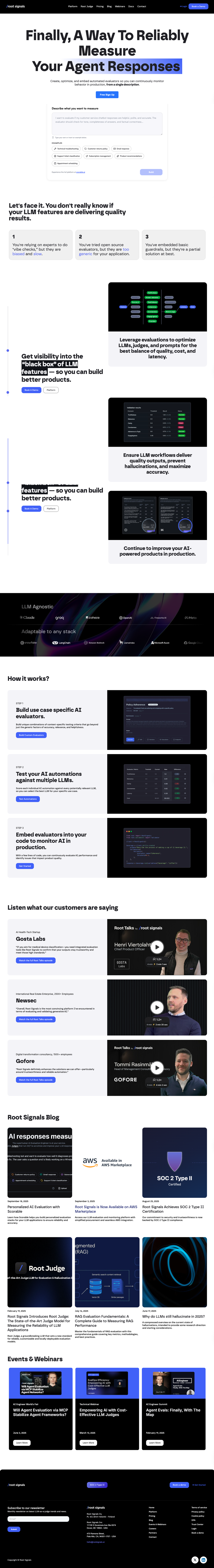 Root Signals had strong tech but unclear positioning. Their homepage mixed audiences and vague promises (“measure and control LLMs”). We helped them sharpen focus on AI engineers