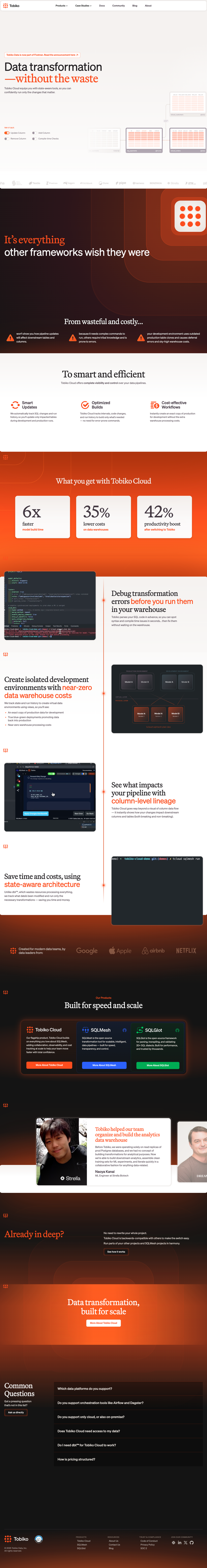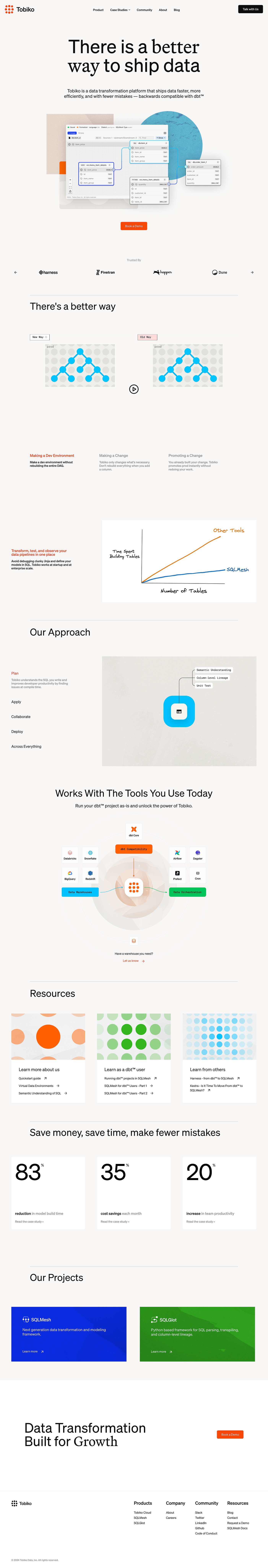 Tobiko came to Fletch because their homepage wasn’t making their differentiation clear. Prospects knew them as the team behind SQLMesh, but were confused about what Tobiko Cloud offered, and why it was better than DBT. We helped sharpen their positioning by leaning directly into the DBT comparison, reframing Tobiko Cloud as the DBT replacement for data engineers. The new messaging distilled their edge into four clear arguments — SQL parsing, state awareness, column-level lineage, and virtual test environments — and clarified the story for their champion: data engineers frustrated with DBT’s scaling limits.