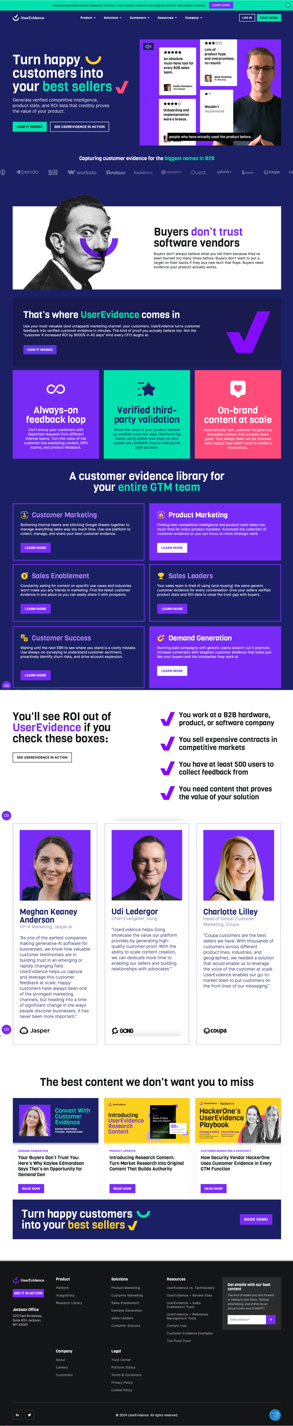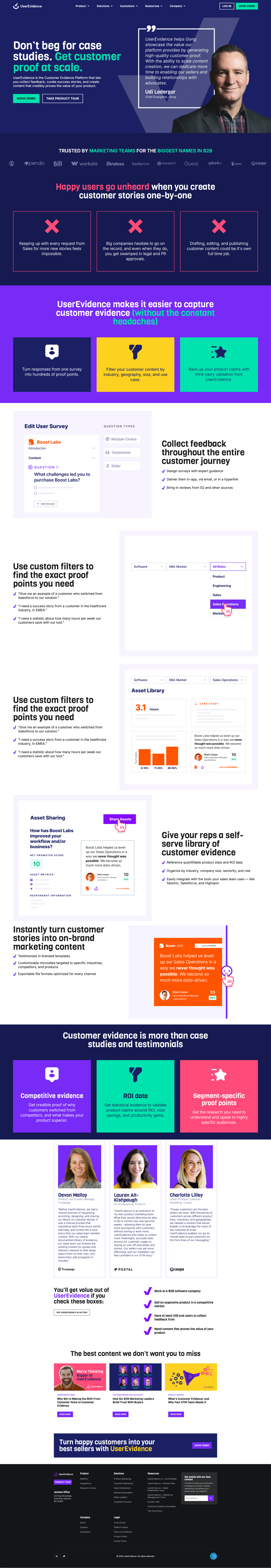 UserEvidence came to Fletch looking for guidance on ways to clearly explain what their product does and how it's differentiated from simple social proof tools. We helped them to focus in on the key use case of collecting customer stories, and lead with a value prop centered on collecting stories at scale (rather than asking customers one by one.)